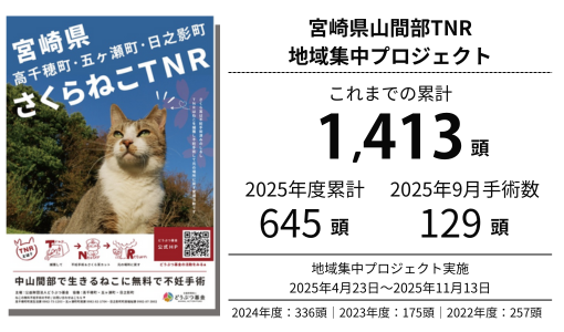 4月~7月に実施をした「宮崎県山間部TNR地域集中プロジェクト」ですが、延長が決まり9月と11月にそれぞれ3日間ずつ実施されることとなりました。