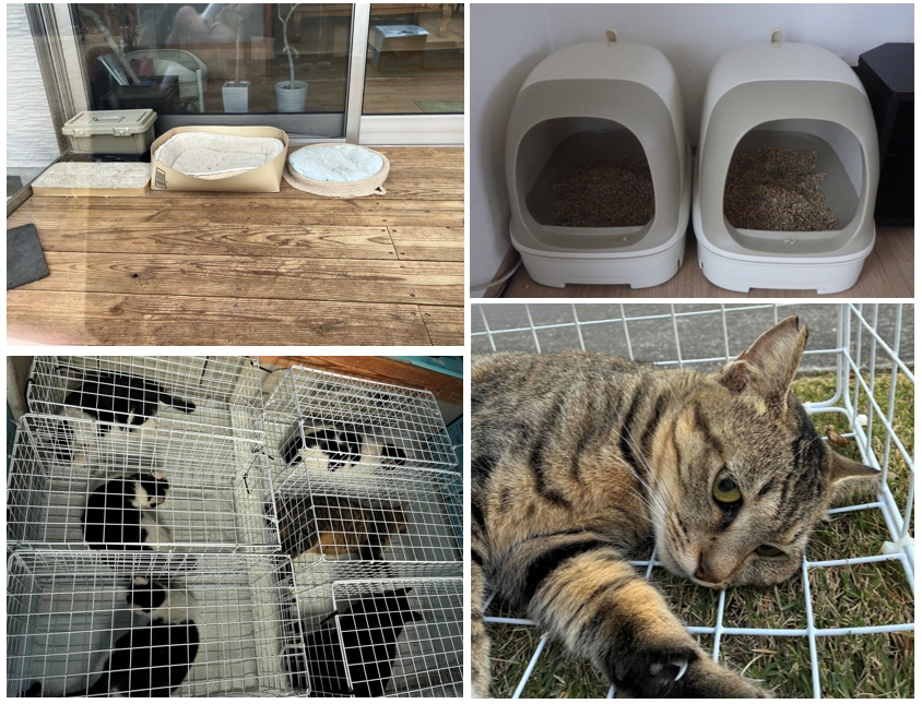 - そのうち20頭の猫が自宅付近に住みつき、2025年5月頃に室内に出入りしていた4頭が室内で出産、子猫が6頭生まれた。6頭のうち2頭は譲渡先が見つかったが、10月に入ってから、外に住みついている猫が子猫を3頭出産した。