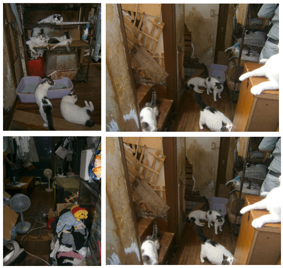 - 多頭飼育状態に陥るまでの期間は不明。拾った3頭はオス1頭とメス2頭だったが、子猫だったこともあり不妊手術をせずに飼育していたところ、どんどん増えてしまった。
