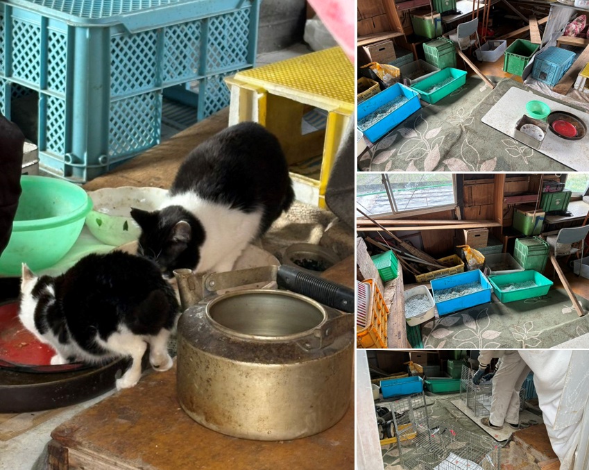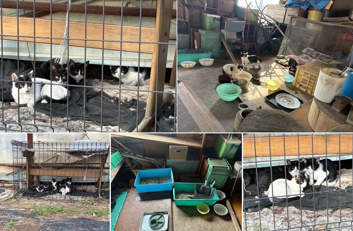 - 猫がいる小屋の中は餌皿やトイレが適切に管理されていた。小屋の床の穴から自由に出入りできる状態であったため、修繕による侵入防止、繁殖を防ぐために雌雄を分けて飼養するよう指導を行った。